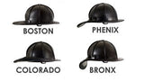 All our stock helmets meet NFPA current requirements and include: leather shell with inner thermoplastic dome, impact cap, comfort pad on all suspension liners, black Nomex combination chinstrap (postman slide / quick release), 8" black detachable earflap, NFPA goggle with long strap, American made custom "Rising Phenix" finial, reflective lime-yellow tetrahedrons and D-ring on the back brim.